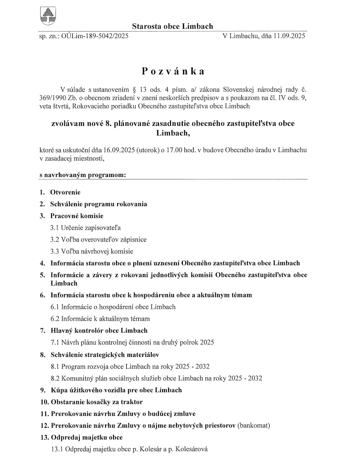 ktoré sa uskutoční dňa 09.09.2025 (utorok) o 17.00 hod. v budove Obecného úradu v Limbachu v zasadacej miestnosti,