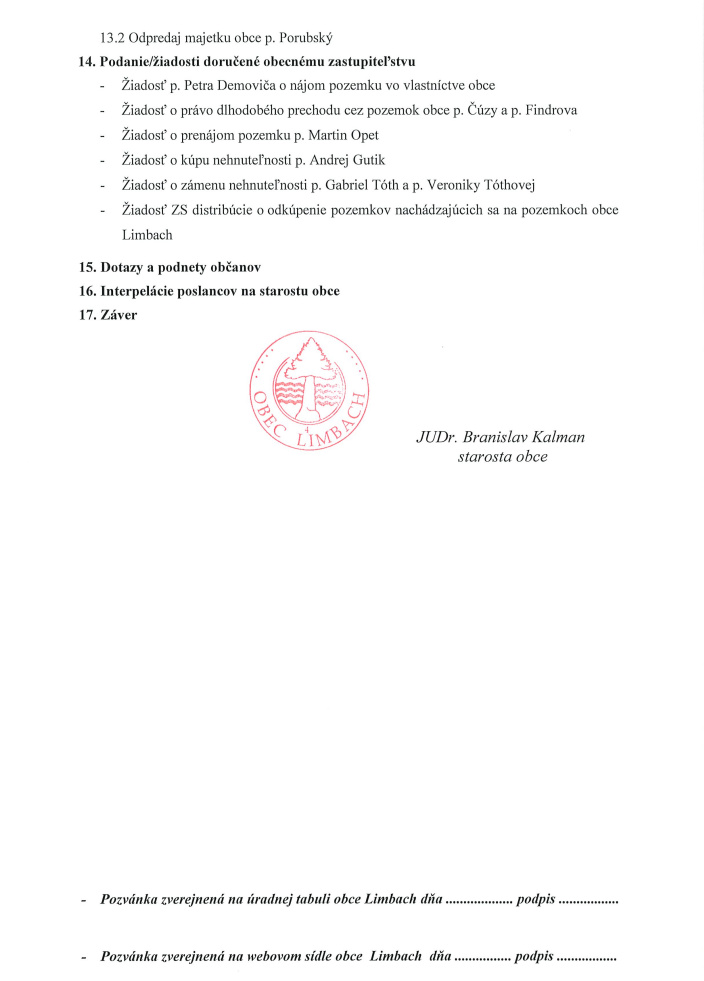 zvolávam 9. neplánované zasadnutie obecného zastupiteľstva obce Limbach,