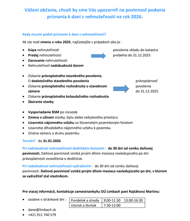 Informácie k podaniu priznania k dani z nehnuteľností na rok 2026