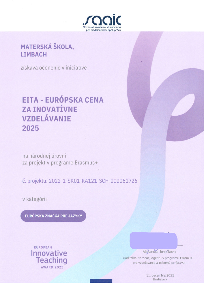 Toto ocenenie, udeľované Európskou komisiou už od roku 1998, oceňuje organizácie, ktoré inovatívnym spôsobom prispievajú k jazykovému vzdelávaniu. Naša MŠ bola ocenená konkrétne za inovácie a výučbu francúzskeho jazyka v rámci projektu evidovaného pod číslom 2022-1-SK01-KA121-SCH-000061726.